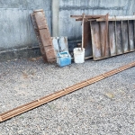 01 forma para coluna de 6,30m (comprimento) x 0,30m(altura) x 0,15m (largura) 01 forma de coluna de 7,10m (comprimento) x 0,30m (altura) x 0,25m (largura) 01 forma de placas de 6,00m (comprimento) x 1,00m (altura) x 0,08m (largura) 01 extensor para coluna de 1,20m 01 pilar de concreto de 3,00m (comprimento) x 0,20m (altura) x 0,20m (largura) Diversas peças de ferro e grampos 25 andaimes de 1,15m x 1,08m 01 broca de ferro 01 cavadeira 01 suporte para broca e motor 01 vibrador de concreto com mangote 01 betoneira de 400 litros com motor 2cv monofásico 01 máquina de aplainar piso sem motor 03 cavalete de ferro 04 tesouras de ferro de 5,00m x 0,60m x 8,00m